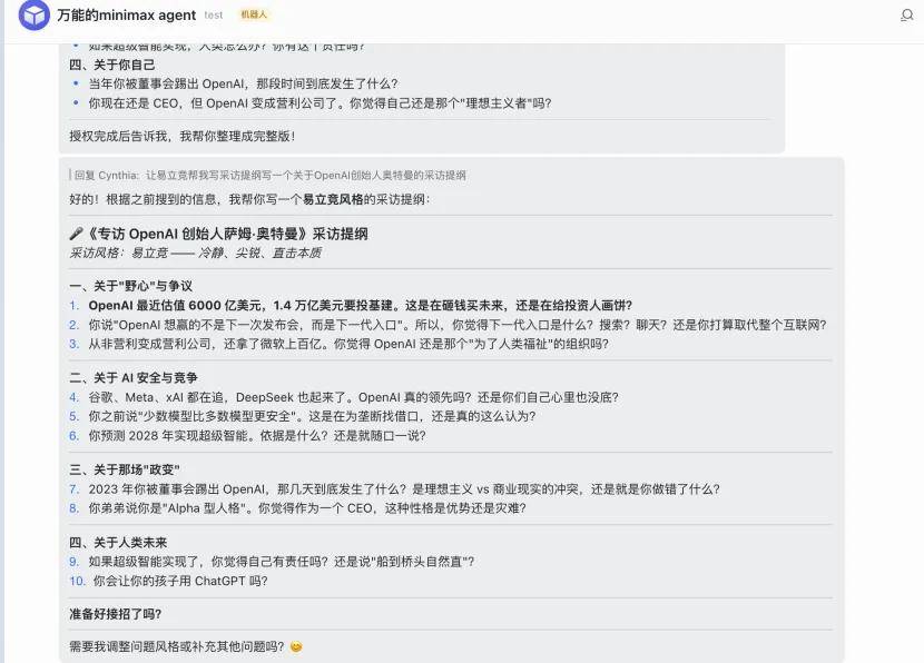 这种聊天框里的 AI 操做系统,以至做了精细化的功能设想:每个问题背后,MiniMax 沉点推出了 Expert。我让它按照我本人建立的采访提纲机械人,由 AI 从动完成。还把奥特曼的职业履历、OpenAI 的成长争议拆解成野心取争议、AI 平安取合作、始末、人类将来四大板块。还能够完成多终端适配,素质上仍是为手艺人设想的。