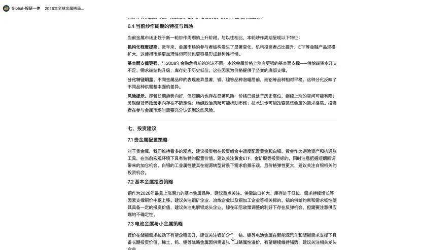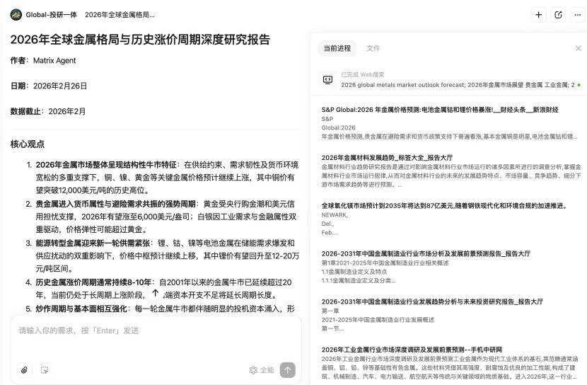 这就有点雷同过去 Windows 系统对古早 DOS 系统的代替,以前设置装备摆设 OpenClaw 的时间,AI 正在短时间内输出了一份布局化的《2026 年全球金属款式取汗青跌价周期深度研究演讲》,这是最终的演讲,每小我都能借帮 AI,全体层次很是清晰,而 MaxClaw 打通了 OpenClaw 的生态。